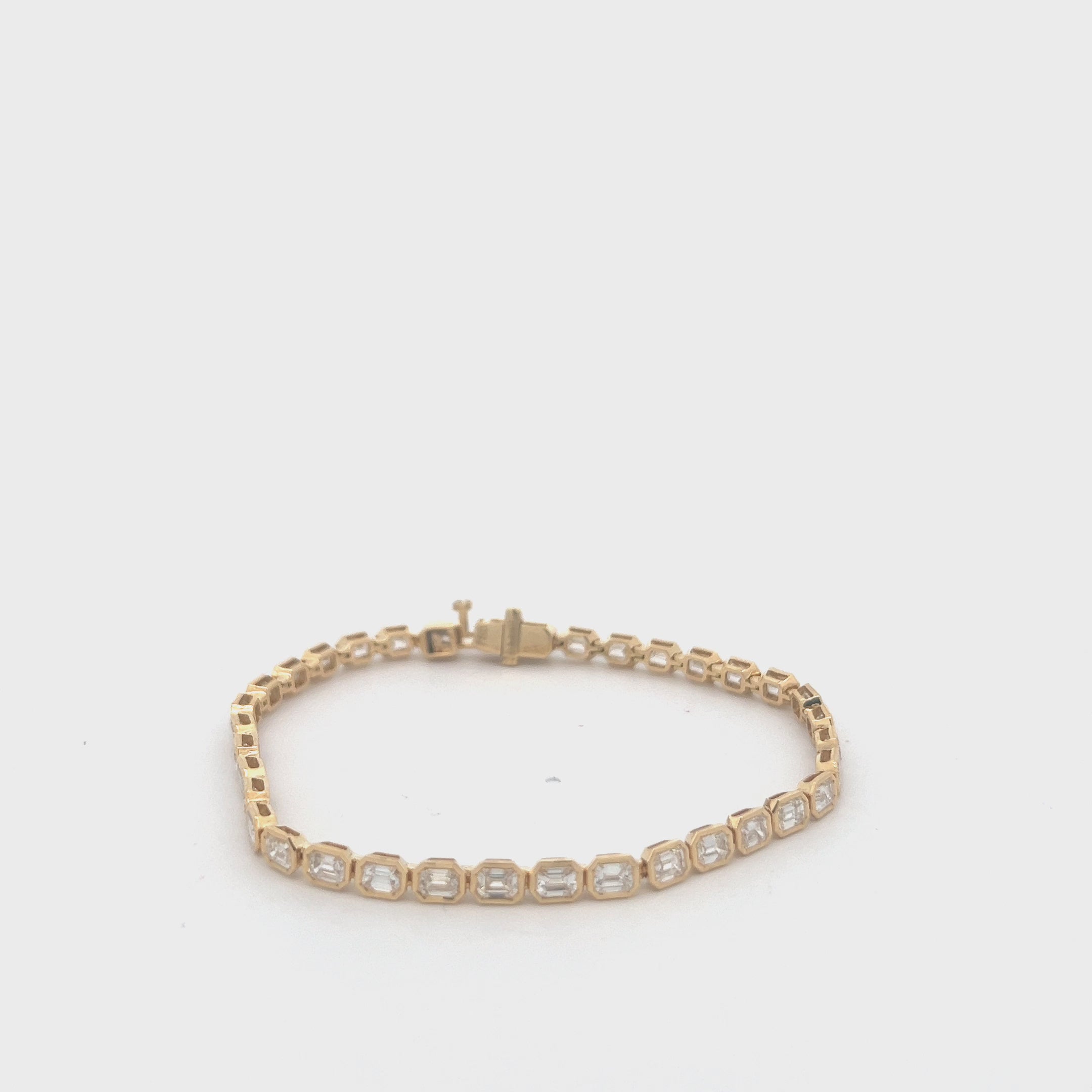The emerald cut diamonds, renowned for their sleek lines and captivating clarity, exude a timeless allure that is both sophisticated and refined. The bezel setting not only enhances the beauty of the diamonds but also ensures their security, making this bracelet as durable as it is stunning.