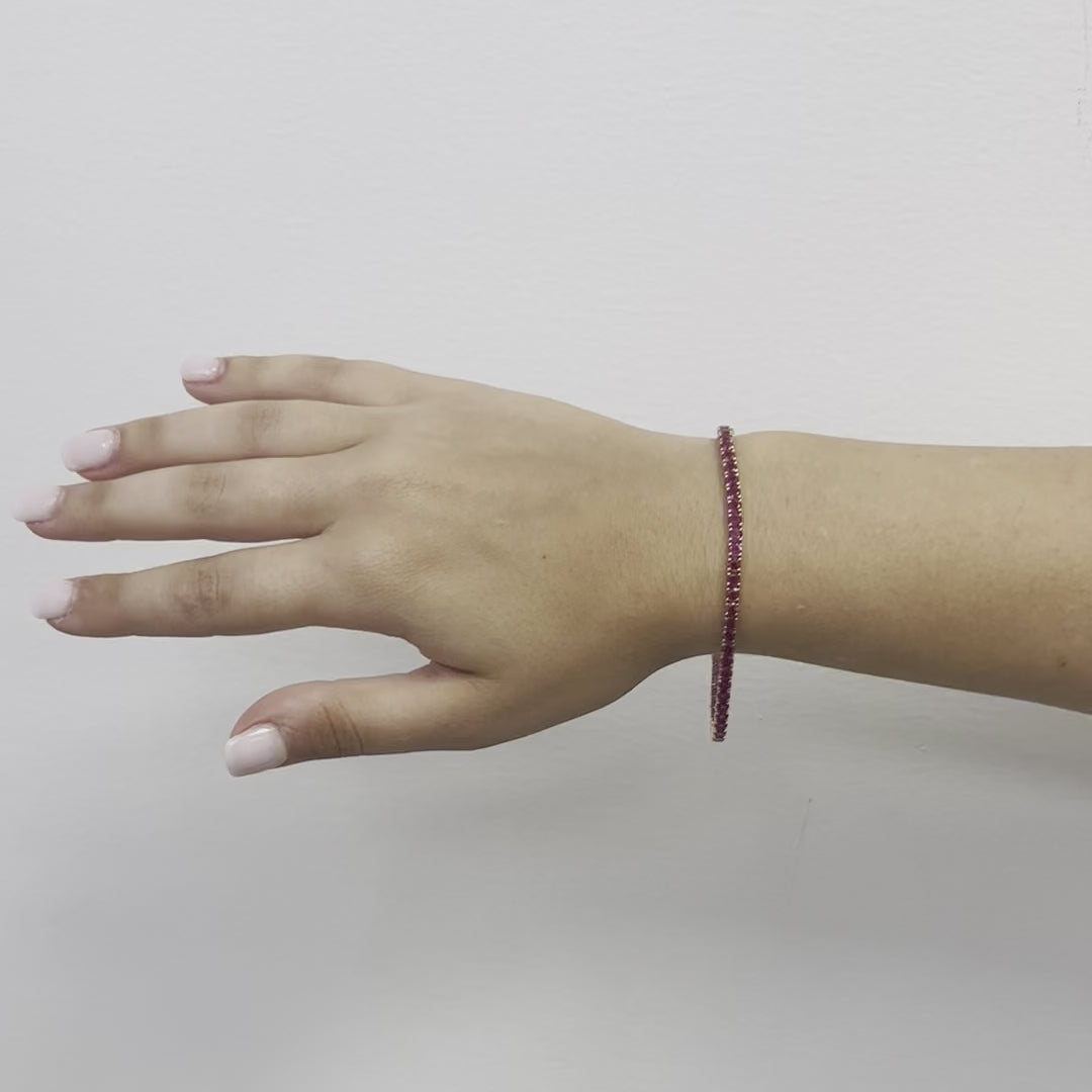 Introducing our genuine Ruby Tennis Bracelet in 18K gold, which features a total carat weight of 9.04 ct. The bracelet is adorned with multiple round-cut rubies, each one measures approximately 3.00 mm in diameter. The rubies are securely held in place by a 4-prong setting made of 14K gold.