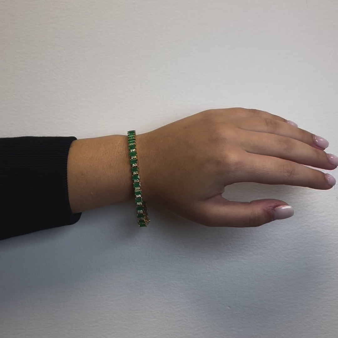 The bracelet showcases a seamless integration of diamonds and emeralds, each held securely in a classic 4-prong setting. The brilliance of the diamonds and the green hue of the emeralds, creates a mesmerizing visual effect that draws the eye.
