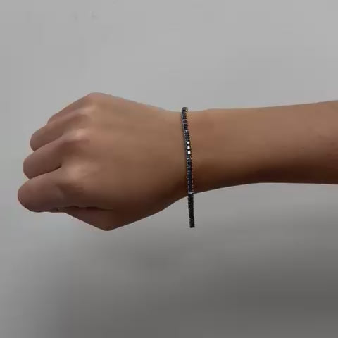 The Princess Cut Blue Sapphire Tennis Bracelet is a stunning piece of jewelry featuring a row of princess-cut blue sapphires set in a 4-prong setting. This bracelet is crafted from 14K gold, known for its durability and lustrous appearance.