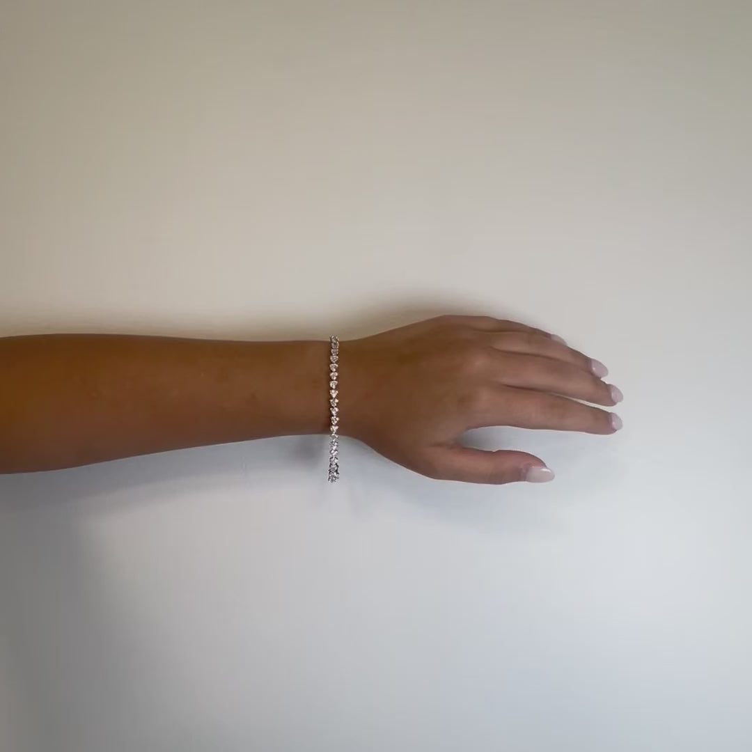 What sets this tennis bracelet apart is its unique design, which showcases heart-shaped diamonds arranged in a slanted pattern along the length of the bracelet.
