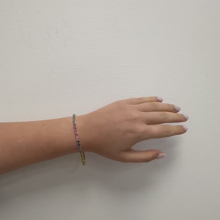 Each sapphire is cut in an emerald shape with step-cut facets, adding to the bracelet's timeless appeal. The sapphires exhibit a stunning array of colors. The unique combination of colors creates a vibrant and playful look that is sure to draw attention.