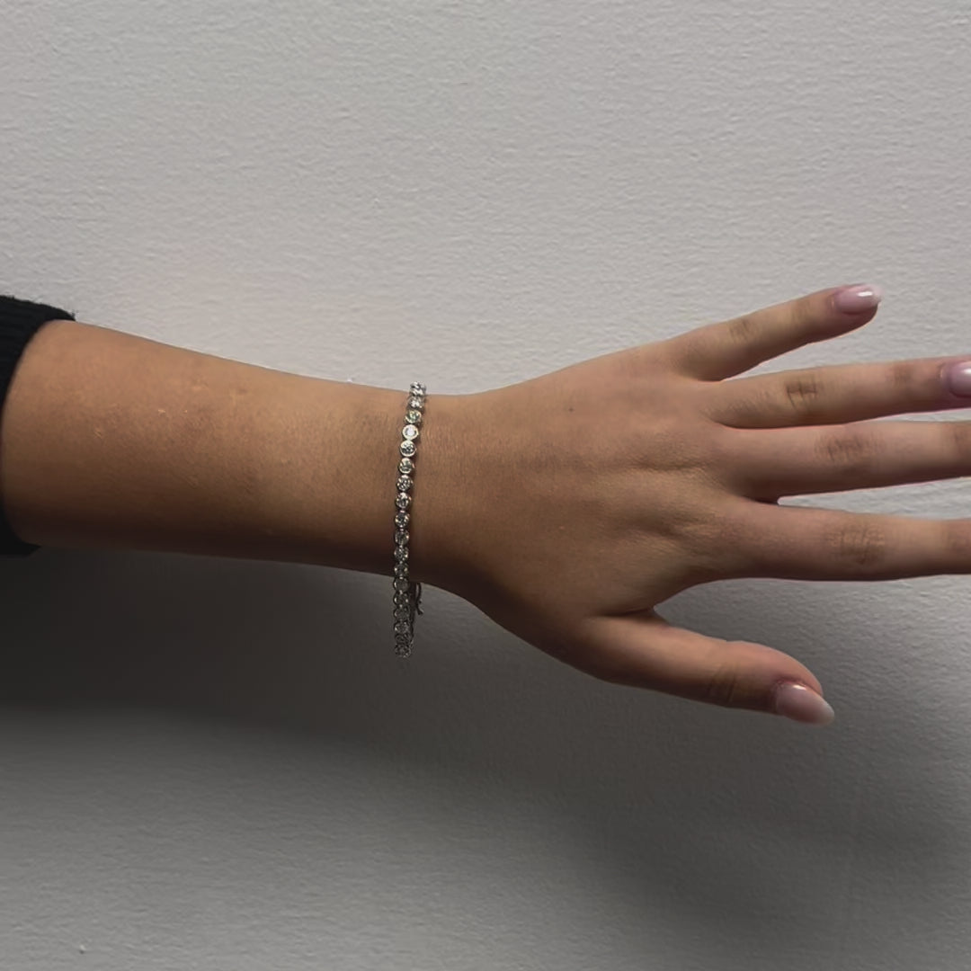 Introducing our Diamond Tennis Bracelet (6.75 ct.) featuring a Bezel Setting in 14K Gold, a refined and contemporary piece of jewelry that combines the brilliance of diamonds with a secure and stylish setting.