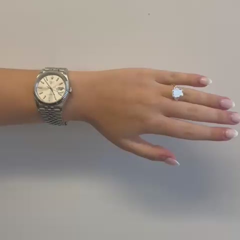 The Capucelli Lab Grown Diamond Emerald Cut 3-Stone Engagement Ring is a striking expression of modern elegance and timeless romance. At the center sits a radiant 4.00 carat emerald cut lab grown diamond, celebrated for its warm, vibrant hue and exceptional brilliance. The cushion cut enhances the diamond’s depth and fire, creating a bold yet refined presence on the hand.